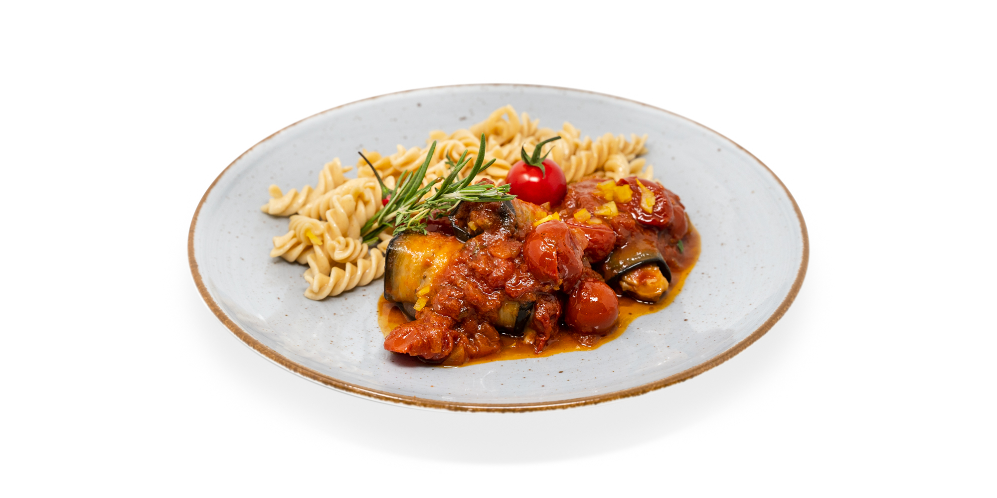 Handgemachte Auberginen-Röllchen mit cremigem Mozzarella in einer schmackhaften Soße aus sonnengreiften Tomaten.