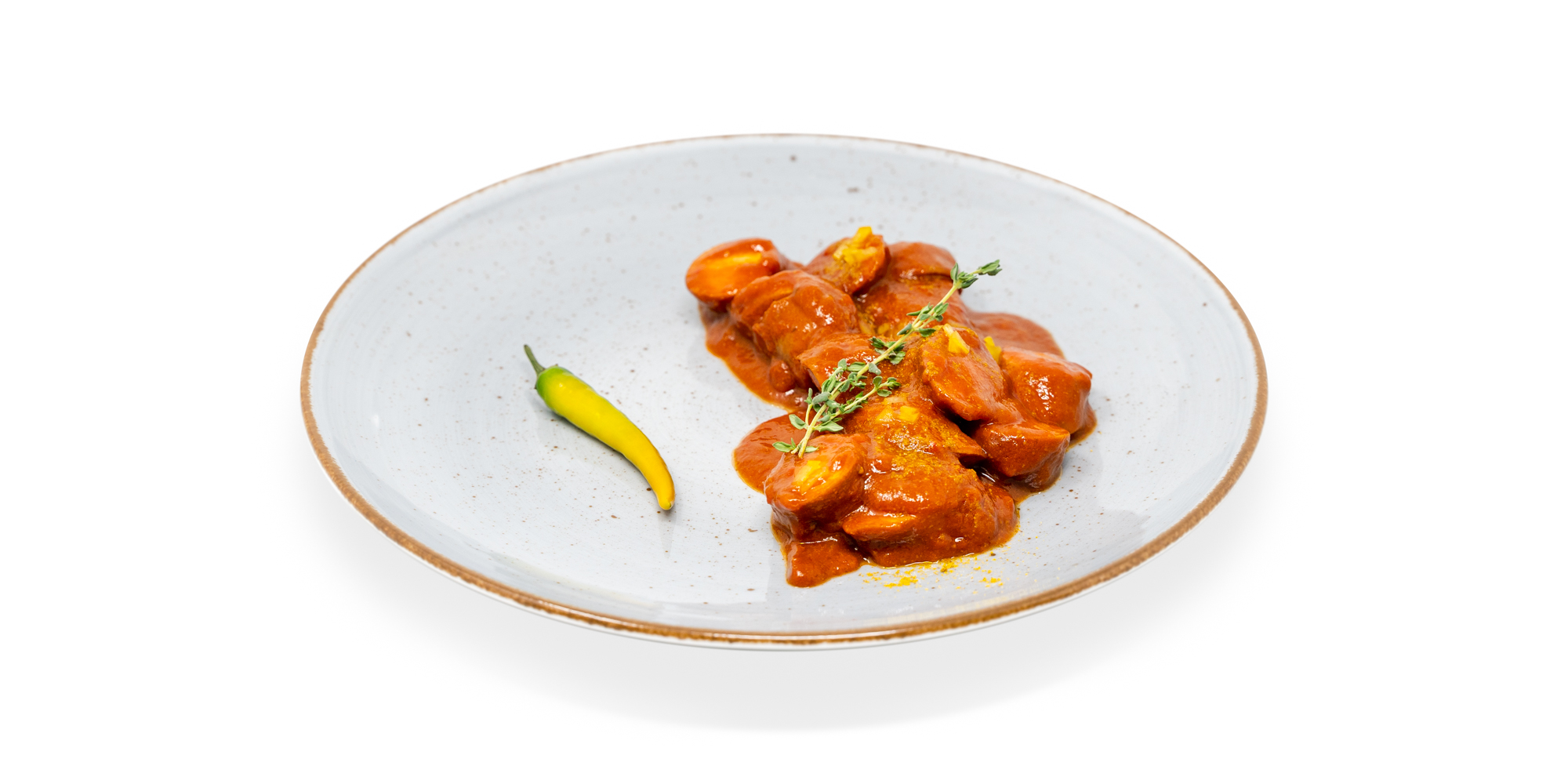 Ein kleiner Imbiss für zwischendurch: Gebrühte Wurst vom Schwein, leicht angebraten in fruchtig- pikanter Tomaten-Curry-Soße.
