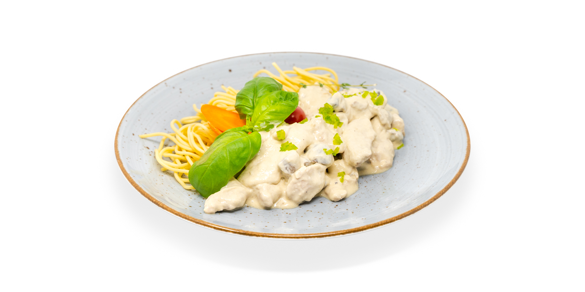 Mageres Hähnchenfleisch in heller Soße mit frischen weißen Champignons.